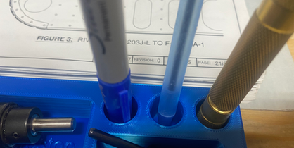 A tray that holds countersink bits and pneumatic/manual squeezer rivet and dimple set. I designed two exact sized slots for easy access to countersink microstop and drill chuck keys, three pen holder slots, and a contoured rivet bin allowing easy retrieval. This was one of my earliest experiment with 3D drawing and printing. I printed w/ PLA. I have forgotten what the infill or print time already.